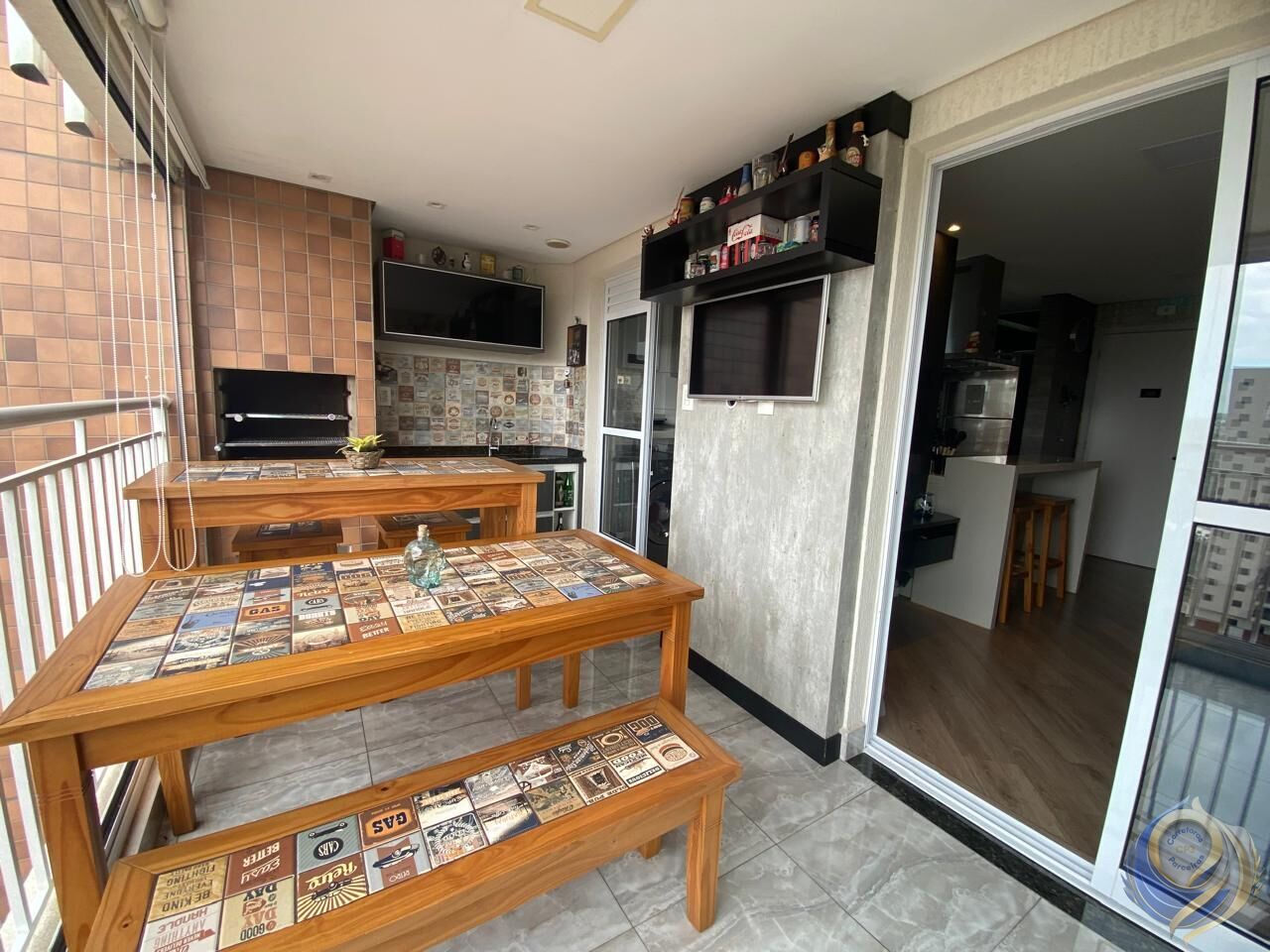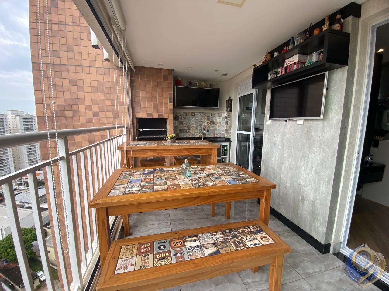 Varanda com churrasqueira a carvão e fechamento em vidro rebatível