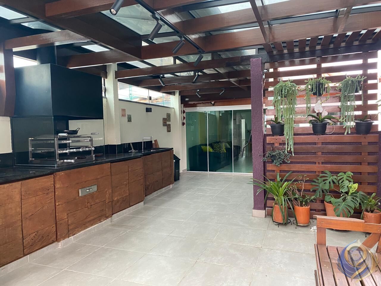 A área gourmet é completa, com churrasqueira, forno de pizza e um agradável espaço de confraternização, ideal para receber amigos e familiares. Toda essa área é coberta com vidro e perfil de alumínio preto, criando um contraste elegante com os balcões e acabamentos em madeira.