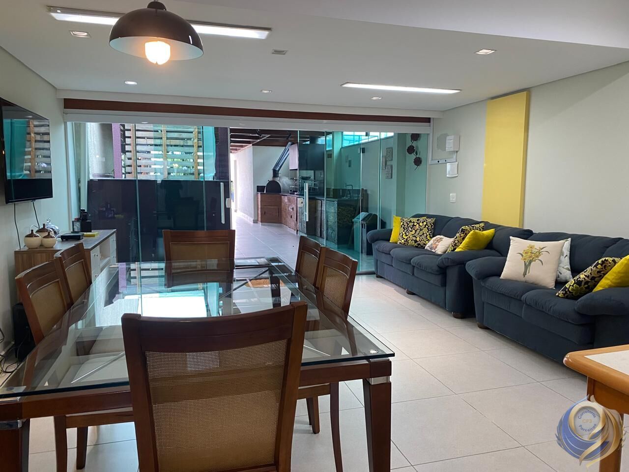 O pavimento superior ainda conta com mais uma sala de convivência, banheiro, cozinha e despensa, formando três ambientes distintos que acomodam confortavelmente eventos, festas e encontros em família.