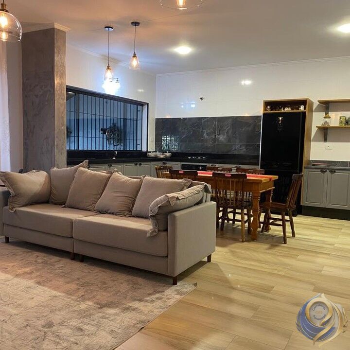 O imóvel conta com dois dormitórios, ambos suítes, sala ampla, cozinha planejada, escritório reversível para terceiro dormitório, área de serviço, quintal com churrasqueira e três banheiros. Possui ainda quatro vagas de garagem.